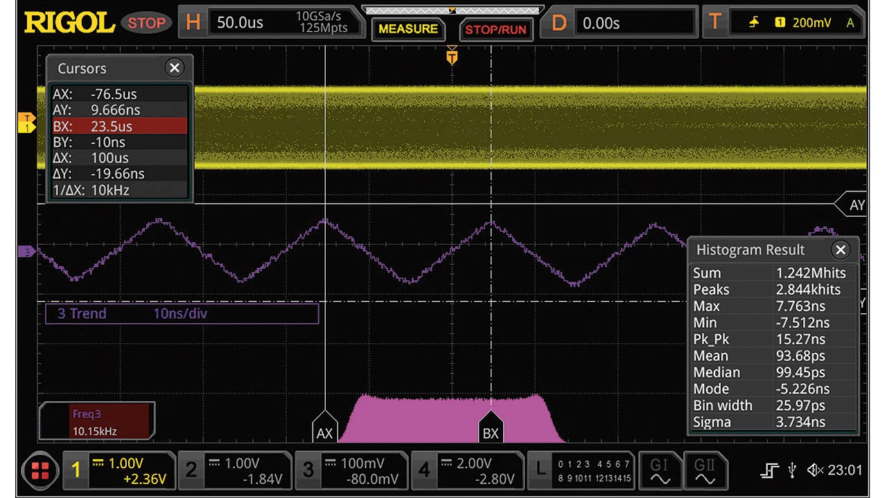 Dabei ist es wichtig, die Art der TIE-Werte und -Trends sowie die Interpretation der Verteilung richtig zu verstehen. Wie bereits beschrieben, wird der TIE als eine sich periodisch anhäufende Änderung des Störsignals berechnet. Das heißt, der TIE-Trend sieht wie das Integral des Störsignals aus. Somit lässt sich aus dem TIE-Trend in Bild 3 eine quadratische Wellenänderung in der Periode ableiten. In diesem Beispiel ist zu sehen, dass sich die Periode des Taktsignals linear vergrößert (Anstieg des Trends) und sich danach wieder linear verkleinert (Abfall des Trends). Durch diese lineare Vergrößerung ist erkennbar, dass die Taktperiode des Signals zwar stabil ist, aber größer sein muss als die erwartete optimale Taktperiode. Genauso verhält es sich mit der linearen Verkleinerung, bei der die Periode ebenfalls einen stabilen Wert haben muss und kleiner ist als die erwartete Periode. Somit ändert sich die Periode zwischen zwei stabilen Werten, die einmal über und einmal unter dem erwarteten Zeitraum liegen. Durch die Frequenzmessung am Trend lässt sich erkennen, dass die Jitter-Ursache an einem 10-kHz-Rechtecksignal liegt. Die Histogrammdarstellung zeigt zudem, dass der Jitter konstant verteilt ist, was dann die Symmetrie des Störsignals bestätigt. Bei der Messung aus Bild 3 konnte die Jitter-Ursache – ein 10-kHz-Taktsignal von einem anderen Bereich der Schaltung – ohne Weiteres ermittelt und abgestellt werden.