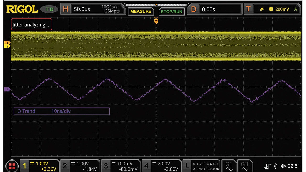 Für die Vermessung des Jitters ist es wichtig, den Zeitintervallfehler (Time Interval Error, TIE) visuell darzustellen. Der Zeitintervallfehler wird durch die Zeitdifferenz zwischen der idealen und der tatsächlich gemessenen Taktflanke definiert. Es gibt zwei Messmethoden für die Vermessung des TIE zur Fehleranalyse: Zum einen die Darstellung des TIE-Trenddiagramms, das den akkumulierten Fehler der TIE-Werte über die Zeit anzeigt, was sich wie eine Integration des Störsignals interpretieren lässt. Diese Trenddarstellung ist ein wertvolles Analysewerkzeug, weil es periodische Jitter-Ursachen hervorhebt. Bild 2 zeigt ein Hochgeschwindigkeitstaktsignal (Kanal 1, gelb) und den TIE-Jitter-Trend (violett).