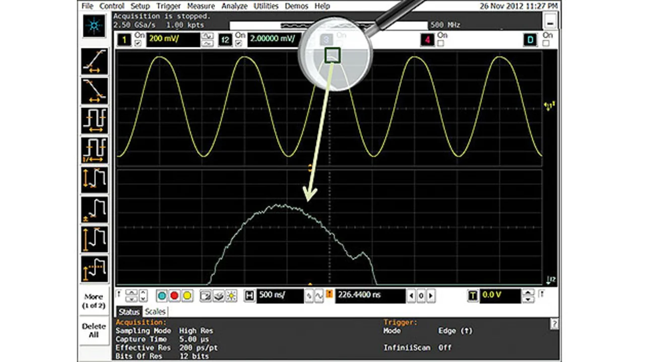 Sobald der A/D-Umsetzer des Oszilloskops bestmöglich genutzt ist, gilt es, auf verdächtige Ereignisse in Teilen des Signals zu zoomen. Im Fall von Signalen mit großem Dynamikbereich ist eine Funktion hilfreich, die den interessierenden Teil des Kurvenzuges vergrößert: Nahezu alle modernen Oszilloskope verfügen über mathematische Funktionen oder ermöglichen Zoom-Fenster, bei denen sowohl die horizontale als auch die vertikale Skalierung unabhängig vom Hauptfenster ist.