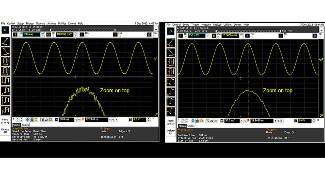 Ein Boxcar-DSP-Filter bildet den Durchschnitt dieser Samples und legt ihn im Messwertspeicher als vertikalen Mittelwert mit der Abtastrate ab, die auf dem Bildschirm angezeigt wird. Dieses Verfahren ermöglicht das statistische Eliminieren eines großen Teils des internen Oszilloskop- rauschens (Bild 4) und ist die wichtigste Eigenschaft des hochauflösenden Modus. Mit dieser Betriebsart lässt sich das interne Oszilloskoprauschen um bis zu einen Faktor 3 reduzieren.