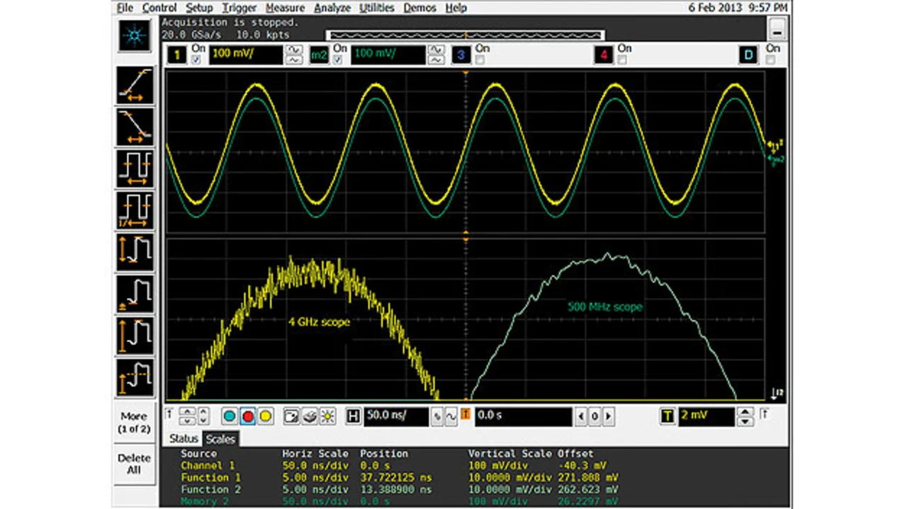 Viele Oszilloskope verfügen über Einstellmöglichkeiten für die Bandbreite (Bild 5). Um das Geräterauschen zu minimieren, sollte beim Beobachten kleiner Signale die Bandbreite auf den kleinstmöglichen Wert eingestellt sein, der den sonstigen messtechnischen Anforderungen gerade noch genügt. Hat das vorhandene Gerät keine solche Einstellmöglichkeit, lässt sich die Bandbreite auch durch den hochauflösenden Modus begrenzen.