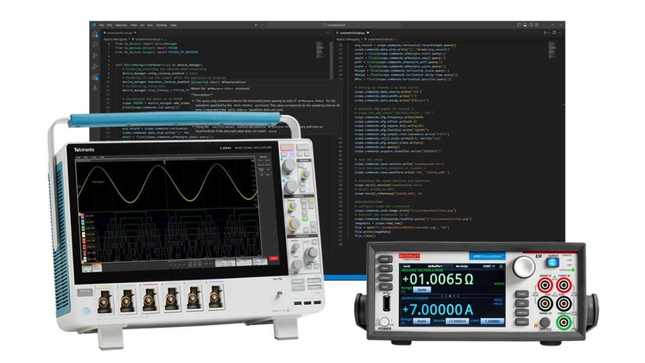 Wie bereits erwähnt, hat sich Python zu einem beliebten Ökosystem für die Testautomatisierung entwickelt. Um die Entwicklung der Python-Automatisierung zu erleichtern, hat Tektronix tm_devices entwickelt, ein Paket von Treibern, die PI und Python für eine nahtlose Geräteautomatisierung kombinieren. Wenn Sie dieses Paket mit einer IDE (engl. „Integrated Development Environment“) wie VSCode verwenden, können Kunden die Automatisierung nativ in Python schreiben und haben die Automatisierungsdokumentation direkt zur Hand. Dieses Open-Source-Paket, tm_devices, ist für jeden frei zugänglich, so dass es erweitert werden kann, um mehr Instrumente zu unterstützen, oder um an die Kundenanforderungen angepasst zu werden.