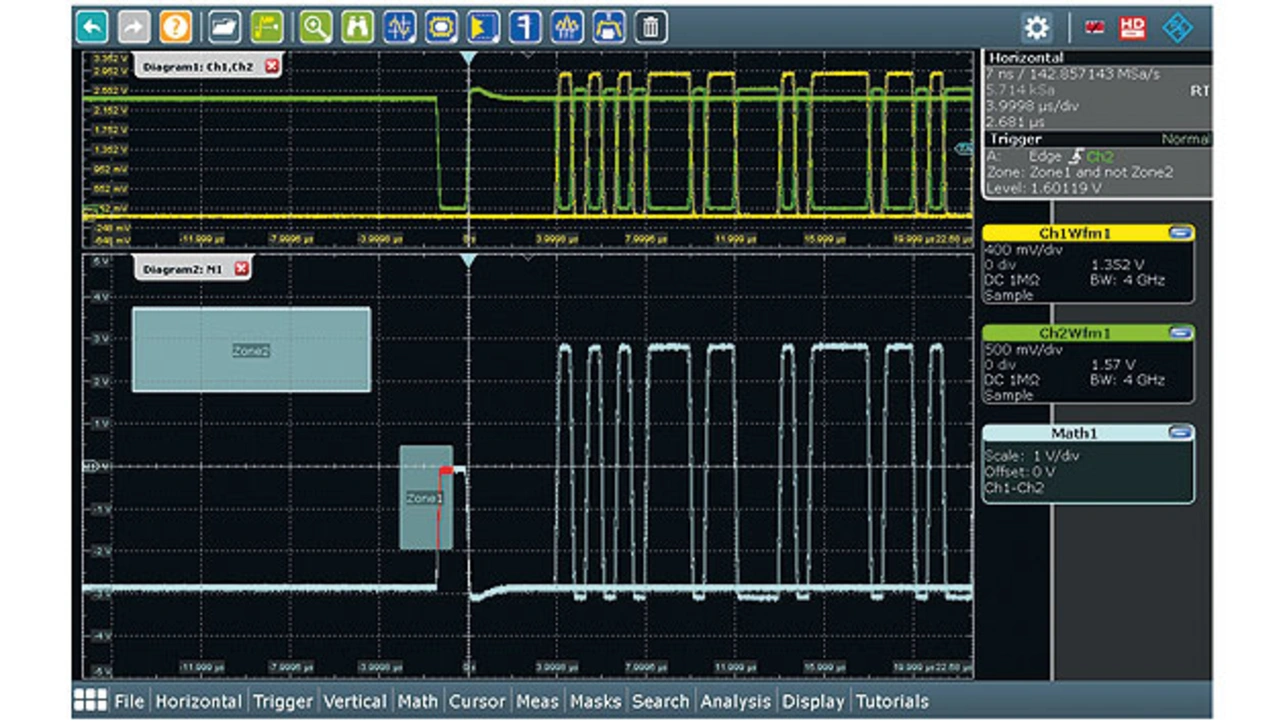 Zone-Trigger-Anwendungen sind in der Regel auf leistungsfähigen Oszilloskopen verfügbar. Deutliche Unterschiede zwischen den Zone-Trigger-Lösungen verschiedener Oszilloskop-Hersteller sind in Bezug auf die möglichen Quellen für die Zonen festzustellen. Alle Zone-Trigger-Lösungen ermöglichen Nutzern die Auswahl eines analogen Kanals als Zonenquelle. Auch die Anwendung von Zonen auf mathematische Funktionen ist bei einigen Herstellern möglich. Mathematik wird üblicherweise als Quelle für die Leistungsanalyse und differenziell geführte Signale eingesetzt. Die Möglichkeit des Zone-Triggers auf Grundlage von mathematischen Quellen kann daher von großem Nutzen sein. Herkömmliche Oszilloskop-Trigger arbeiten mit Zeitbereichssignalen und können nicht im Frequenzbereich genutzt werden. Der Zone-Trigger von Rohde & Schwarz ist die einzige Möglichkeit für eine kombinierte Triggerung im Frequenz- und Zeitbereich.