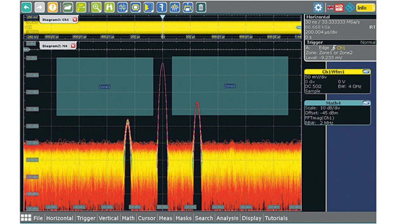 Der Zone-Trigger von Rohde & Schwarz kann beispielsweise im Frequenzbereich genutzt werden, um alle Ereignisse zu isolieren, bei denen ein Seitenband einen bestimmten Pegel überschreitet. Die Technik ist auch im Zeitbereich einsetzbar. Nach Anschluss einer Stromzange und eines Spannungstastkopfs kann mittels Multiplikation die Leistung ermittelt werden. Übersteigt die Leistung einen per Zone-Trigger festgelegten Grenzwert, wird diese angezeigt.