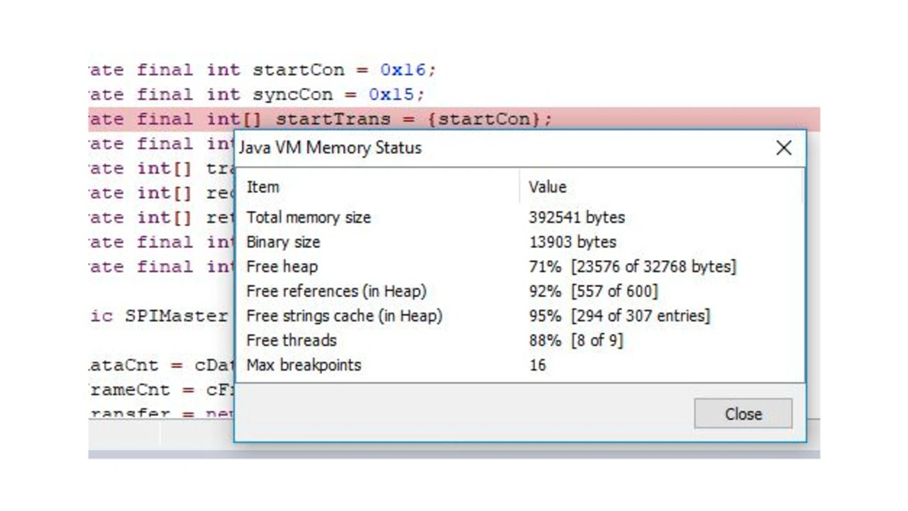 Ein Terminal zeigt separate Reiter für Übersetzer- (Output) und Ziel-Konsole (Console). Unter Ausführungsstart wird ein zusätzliches Fenster für die Evaluation von Java-Symbolen auf dem Ziel angezeigt. Der Speicherstatus zeigt nur noch den Speicherstatus der JavaVM und keine low-level Stack-Inhalte (Bild 6). Auch ein Call-Stack, der die Klassen-Aufruf-Hierarchie der aktuellen Ausführung zeigt, ist vorhanden. Unter Windows kann ein vorhandener Java-Stream mit einem Konsolenprogramm direkt auf das Ziel geschrieben werden. Dieser muss natürlich zu JavaVM und unterliegender Hardware passen.
