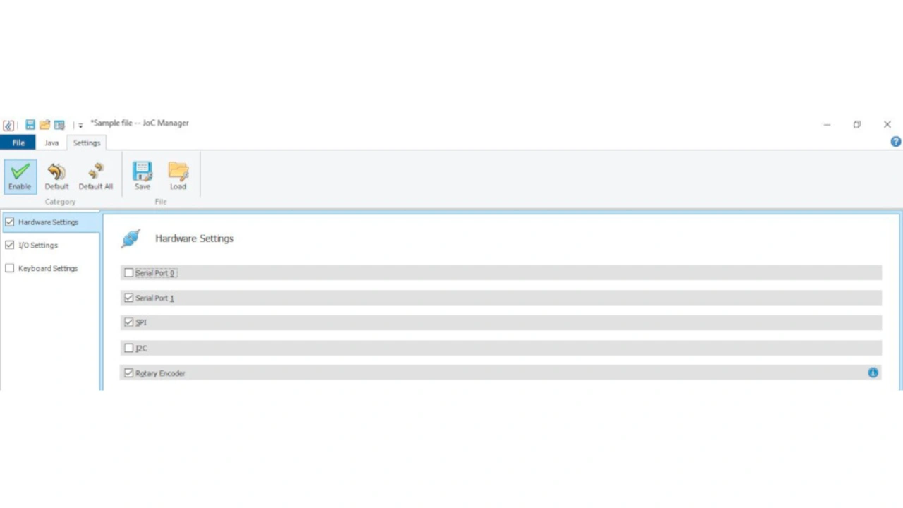 Der JoC-Manager wurde auf einer Windows-10-Maschine getestet: eine Wine-Ausführung etwa unter Fedora Linux ist ohne weitere Modifikation nicht möglich. Die JoC-Manager-IDE ist reduziert und ordentlich gehalten: drei Reiter »File«, »Java« und »Settings« konfigurieren in dieser Reihenfolge Projektverwaltung, Programmierumgebung und die Treiberebene (Pin-Aktivierung, Bild 4). Im File-Reiter trägt die Hilfe-Sektion zwei separate Tracks für Hard- und Software. Neben den IDE-Funktionen ist hier auch die gesamte Java-Bibliotheks- und Sprachbasis dokumentiert (Java Help), die dem Anwender auf dem JoC-Modul zur Verfügung steht. Die Dokumentation ist stringent und effizient gehalten.