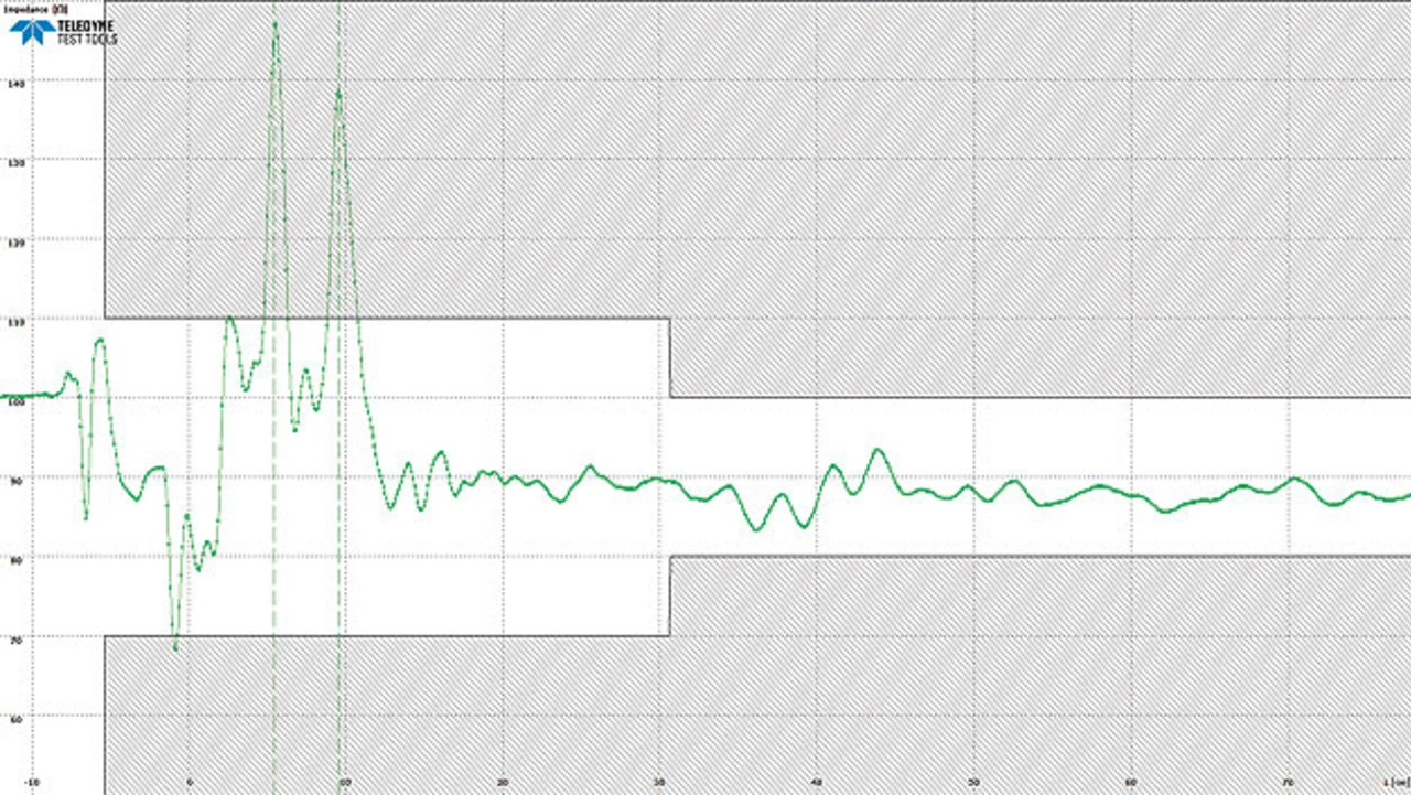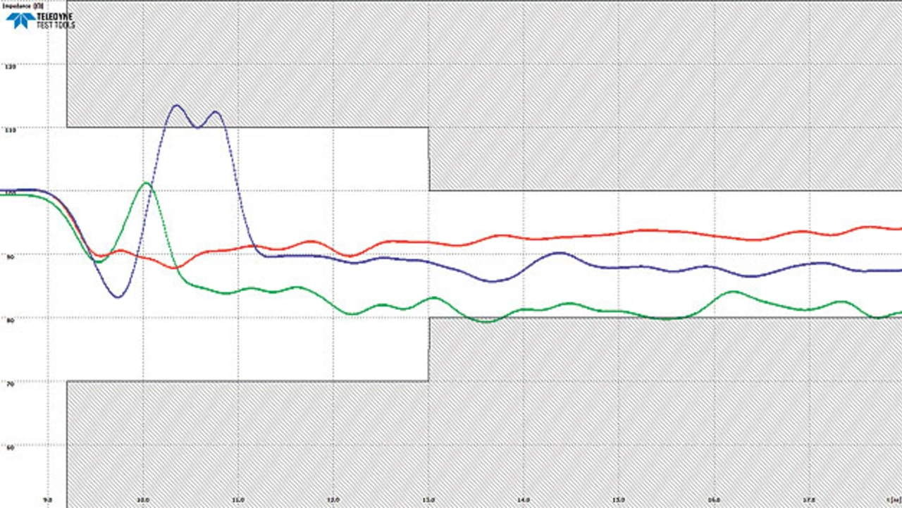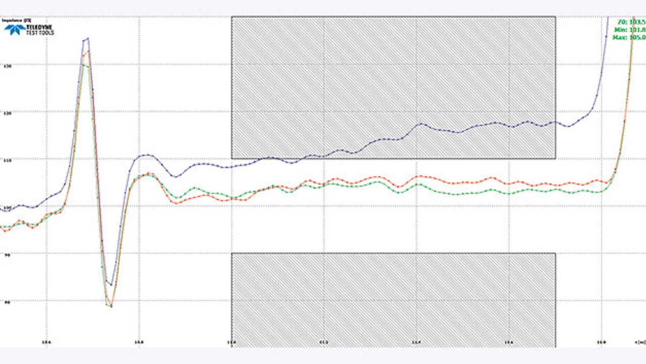 Gut zu sehen ist, dass die Impedanz bei allen Messungen höher als 100 Ohm ist, aber nur die blaue Kurve außerhalb der Toleranz liegt. Durch die Messung der Impedanz an einer Testplatine können sehr schnell Rückschlüsse auf die Fertigungsqualität gezogen werden und es kann verhindert werden, dass fehlerhafte Platinen in die Fertigung kommen. Werden fehlerhafte Platinen zum Beispiel erst bei der finalen Funktionsprüfung gefunden, sind diese Kosten erheblich höher als die einer Stichprobenprüfung beim Wareneingang.