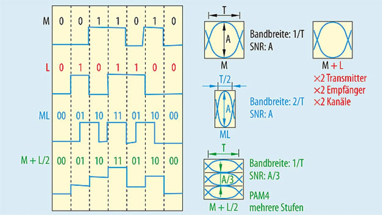 Der nächste Ansatz wäre es, die beiden Datenreihen hintereinander, aber mit der doppelten Geschwindigkeit zu schicken. Statt einer 28‑Gbit/s-Leitung hätten wir dann eine mit 56 Gbit/s. In der gleichen Zeit, in der bei 28 Gbit/s ein Bit übertragen wurde, sind es jetzt mit 56 Gbit/s zwei Bit. Das wird in Bild 1 mit der Datenreihe ML dargestellt.
