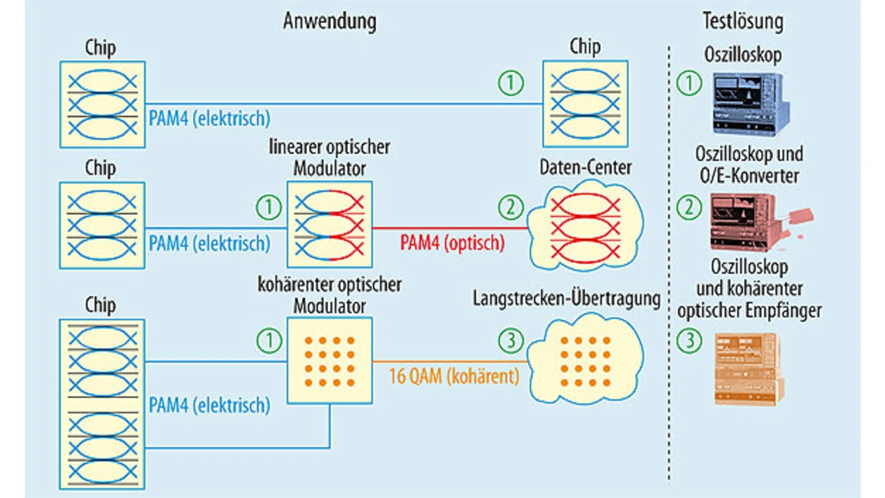 Ein anderer Anwendungsfall für PAM4 ist der Versand eines elektrischen Signals von einem Chip zu einem optischen Modulator (Bild 2 Mitte, linker Teil). Der optische Modulator überträgt mit Hilfe eines Lasers das elektrische Signal in optische Intensitäts- oder Helligkeitsstufen. Das elektrische PAM4-Signal wird somit in ein optisches PAM4-Signal umgewandelt. Umwandlung von elektrischen PAM4- in optische PAM4-Signale durch einen linearen optischen Modulator findet man häufig in Daten-Centern, wo große Datenmengen zwischen Servern oder Gebäuden übertragen werden. Unternehmen wie Cisco, Google und Facebook sind hier die typischen Anwender für PAM4-Applikationen. Eine dritte Anwendung verwendet zwei elektrische PAM4-Signale (Bild 2, unten links). Anstatt die elektrischen Signale in einen linearen optischen Modulator zu leiten, um sie in optische Helligkeitsstufen umzuwandeln, werden sie in einen kohärenten optischen Modulator geleitet, der die beiden Signale in ein moduliertes optisches Signal mit entsprechender Amplitude und Phase umsetzt. Links unten im Bild sehen wir zwei elektrische PAM4-Signale als Ein- Fortsetzung auf S. 18 gänge für den kohärenten optischen Modulator. Zwei Signale mit jeweils vier möglichen Werten ergeben dann kombiniert 16 mögliche Werte und damit ein sogenanntes kohärentes 16-QAM-Signal. Anwendungen hierfür finden sich in den neuesten Generationen von optischen Langstrecken-Übertragungen, wie sie zum Beispiel in den Unterwasser-Glasfaserleitungen zwischen Kontinenten eingesetzt werden.