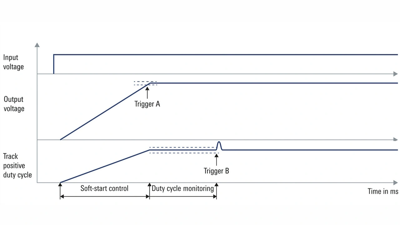 Nach dem Einrichten startet der Wandler und das Softstartverfahren wird ausgeführt. Nachdem der Trigger einen gültigen Auslöser für Bedingung A erkennt, wartet das Gerät auf eine Veränderung des gemessenen Tastgrads. Unter der Annahme einer konstanten Last nach dem Softstart würde das Gerät bei Bedingung B nicht auslösen, weil der Tastgrad konstant bleiben sollte.