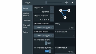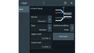 Weil zwei Trigger-Bedingungen nötig sind, um Schwankungen des positiven Tastgrads nach dem Ende der Softstartphase festzustellen, können mit dem Oszilloskop auch komplexe Trigger-Bedingungen definiert werden. Bild 1 zeigt die Trigger-Bedingungen, wenn der Wandler anläuft. Die Trigger-Bedingung A dient zur Detektion des Endes der Softstartrampe und ist als Fenstertrigger konfiguriert. Die Ausgangsspannung muss hierbei in einen festgelegten Bereich fallen. Der Typ des Triggers für Bedingung B kann auf der PWM-Pulsbreite basieren.