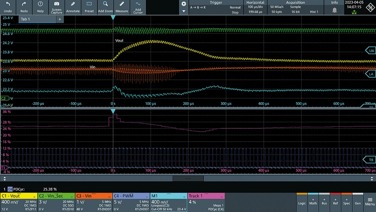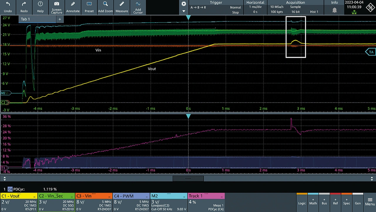 Die aufgezeichnete Messung ist in Bild 5 dargestellt. Die Ausgangsspannung wurde auf Kanal 1 und die Eingangsspannung auf Kanal 3 gemessen. Kanal 2 zeigt ein internes Signal des Reglers, das die Eingangsspannung auf der Sekundärseite wiedergibt. Kanal M2 zeigt den durch einen Tiefpassfilter mit Mathematikfunktion gefilterten Kanal 2. Zudem werden im unteren Fenster das PWM-Steuersignal (Kanal 4) und die Track Waveform für den positiven Tastgrad angezeigt.