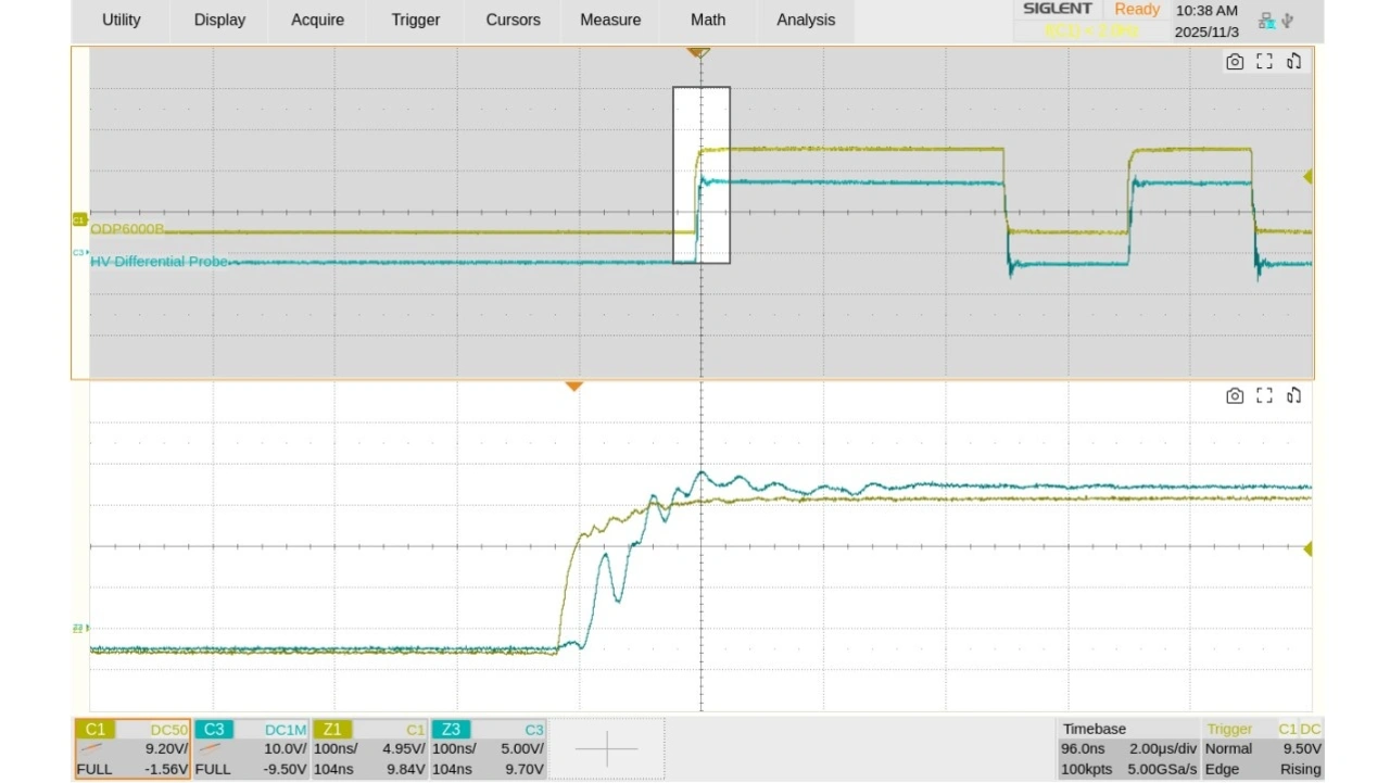 Die optisch isolierten Differenztastköpfe der Serie Siglent ODP6000B bieten hier eine überzeugende Lösung: Mit Bandbreiten von 500 MHz bzw. 1 GHz und einem CMRR von bis zu 160 dB bei niedrigen Frequenzen und 80 dB bei 800 MHz ermöglichen sie präzise, störungsfreie Messungen selbst an schnell schaltenden High-Side-Transistoren. In Kombination mit den Oszilloskopen der Serie SDS5000X HD entsteht so ein leistungsfähiges Messsystem, das auch unter realen Betriebsbedingungen eine exakte Charakterisierung von SiC- und GaN-Schaltungen erlaubt. Dadurch lassen sich Schaltverluste, Gate-Ansteuerung und EMV-Verhalten zuverlässig erfassen und optimieren. Damit sind sie ein entscheidender Baustein für die Entwicklung effizienter, moderner Leistungselektronik.