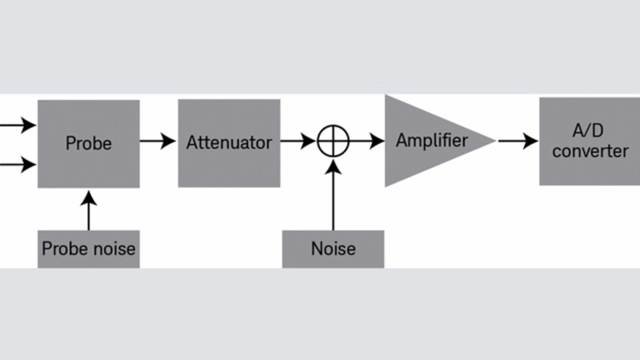 Bild 2 veranschaulicht die Rauschquellen eines Oszilloskops. Ein Oszilloskop mit aktivem Tastkopf hat zwei dominante Rauschquellen: Den Vorverstärker im Tastkopf und den Eingangsverstärker (Impedanzwandler) im Oszilloskop.