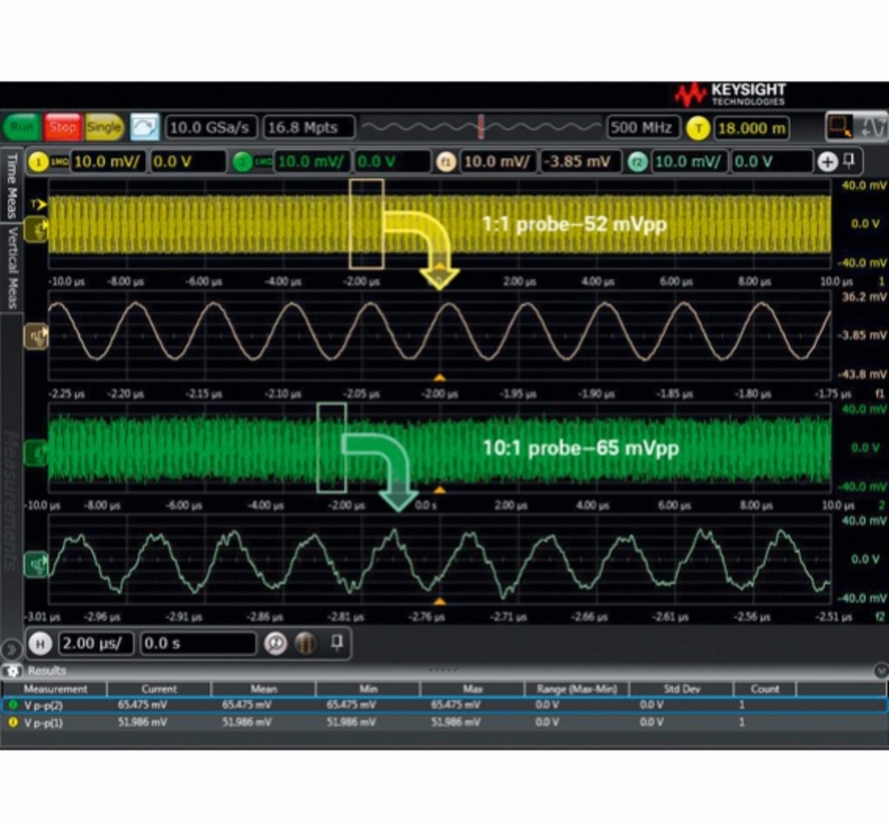 Als konkretes Beispiel sei ein Oszilloskop betrachtet, das eine Grundempfindlichkeit (Dämpfungsfaktor 1) von 5 mV/div und ein Eigenrauschen von 500 µV(eff) bei 5 mV/div aufweist. Wenn die Eingangsempfindlichkeit des Oszilloskops auf beispielsweise 50 mV/div sinkt (Dämpfungsfaktor 10), wird das Eingangssignal um das Zehnfache abgeschwächt (Bild 3). Das Rauschen erscheint dann gegenüber dem Messsignal um Faktor 10 stärker, also 10 x 500 µV = 5 mV(eff). Selbiges gilt auch für Messungen mit einem Teilertastkopf. Das Eigenrauschen des Oszilloskops erscheint dann relativ zum Eingangssignal um den Teilungsfaktor des Tastkopfs größer.