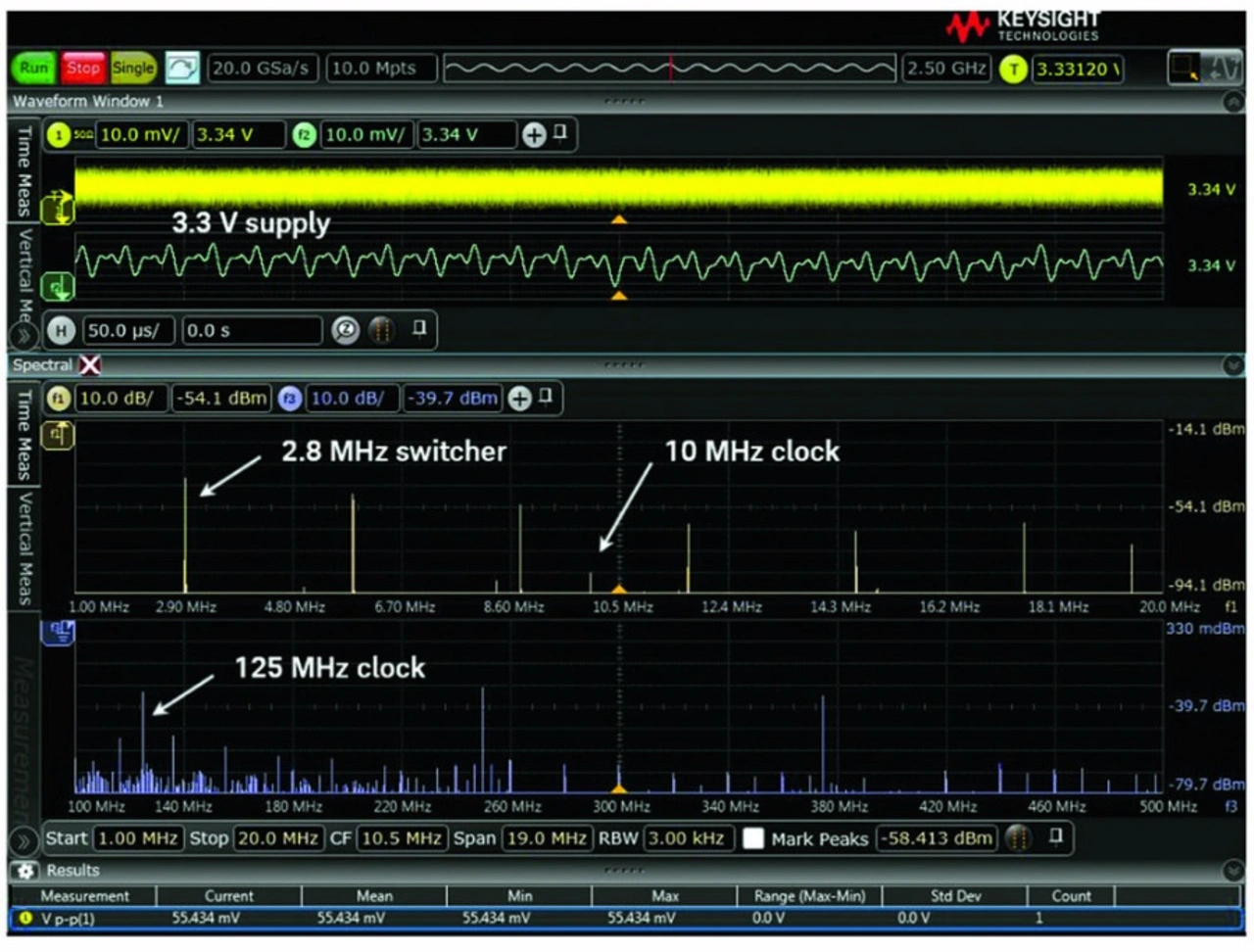 Rauschsignal der Spannungsquelle reduzieren. Mit einem für Messungen an Versorgungspannungen optimierten Tastkopf, etwa dem Keysight N7020A, gelingen die Rauschmessungen noch besser. Beim Teilerverhältnis 1:1 wird ein Spannungsoffset im Bereich von ±24 V appliziert. Am 50-Ω-Eingang des Oszilloskops erfasst der Tastkopf bei 2 GHz Bandbreite hochfrequente Störungen und Transienten, die »Jitter« auf Daten- und Taktleitungen verursachen können. In Verbindung mit einem geeigneten Oszilloskop kann die Bandbreite zur Reduktion des Tastkopf-Eigenrauschens verringert werden, sofern das Messsignal dies zulässt.