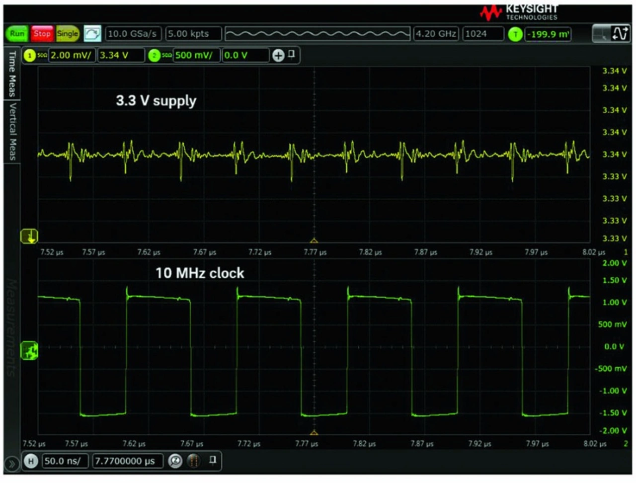 Triggerung erleichtert die Messung periodischer Störspannungen. Das Messobjekt ist weiterhin der 2,8-MHz-Gleichspannungswandler im 10-MHz-Takt-System. Bild 4 zeigt das Messergebnis. Die FFT verifiziert den 10-MHz-Takt am Ausgang des Gleichspannungswandlers, damit kann darauf getriggert werden. Die Messwertemittelung eliminiert zufälliges Rauschen und andere inkohärente Signalkomponenten. Die so verarbeitete Messkurve zeigt den 10-MHz-Takt-Anteil des Störpegels auf der Versorgungsleitung (Bild 5).