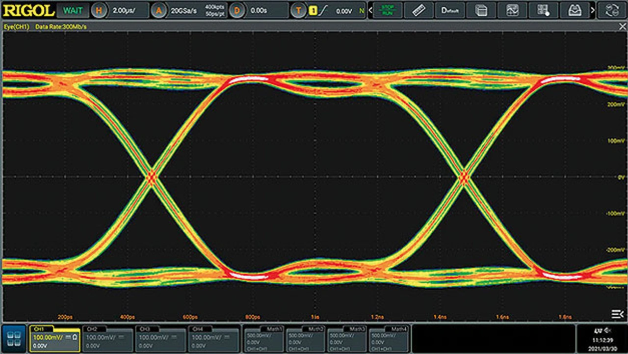 In der Augendiagramm-Darstellung lässt sich auch eine Aussage über die Bandbreite treffen, denn sie steht in Relation zur Anstiegszeit des Augendiagramms. Die Bandbreite des eingesetzten Tastkopfes ist im Augendiagramm ebenfalls sichtbar. Das muss bei der Auswahl des Tastkopfes bedacht werden und ein Tastkopf mit entsprechend hoher Bandbreite gewählt werden, wie es bei dem neuen Rigol-Tastkopf der Serie PVA8000 der Fall ist, um dessen Einfluss auf die Bandbreite und somit auf die Anstiegs- und Abfallzeit des Datensignals zu minimieren.