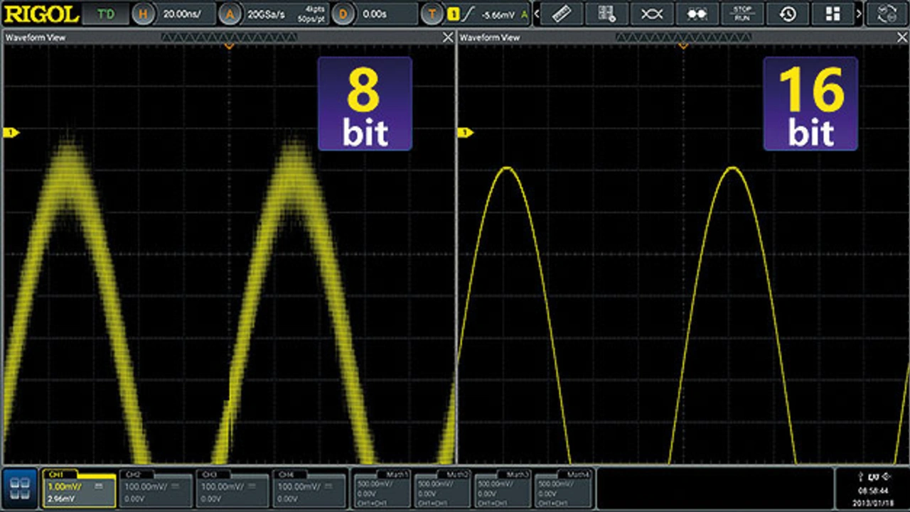 Bei der DS70000-Serie kann man die vertikale Auflösung erhöhen, was speziell für die Analyse in der Leistungselektronik ein wertvolles Werkzeug ist, um bei den Strom- und Spannungsverläufen kleinste Änderungen sichtbar zu machen. Die vertikale Auflösung kann abhängig von der Bandbreite und der Abtastrate bis auf 16 bit aufgelöst werden. Diese Auflösung ist auch deshalb möglich, weilsich das Messsignal erst mit der Bildschirmauflösung von 1920 × 1080 Pixeln entsprechend hochaufgelöst darstellen lässt (Bild 4).
