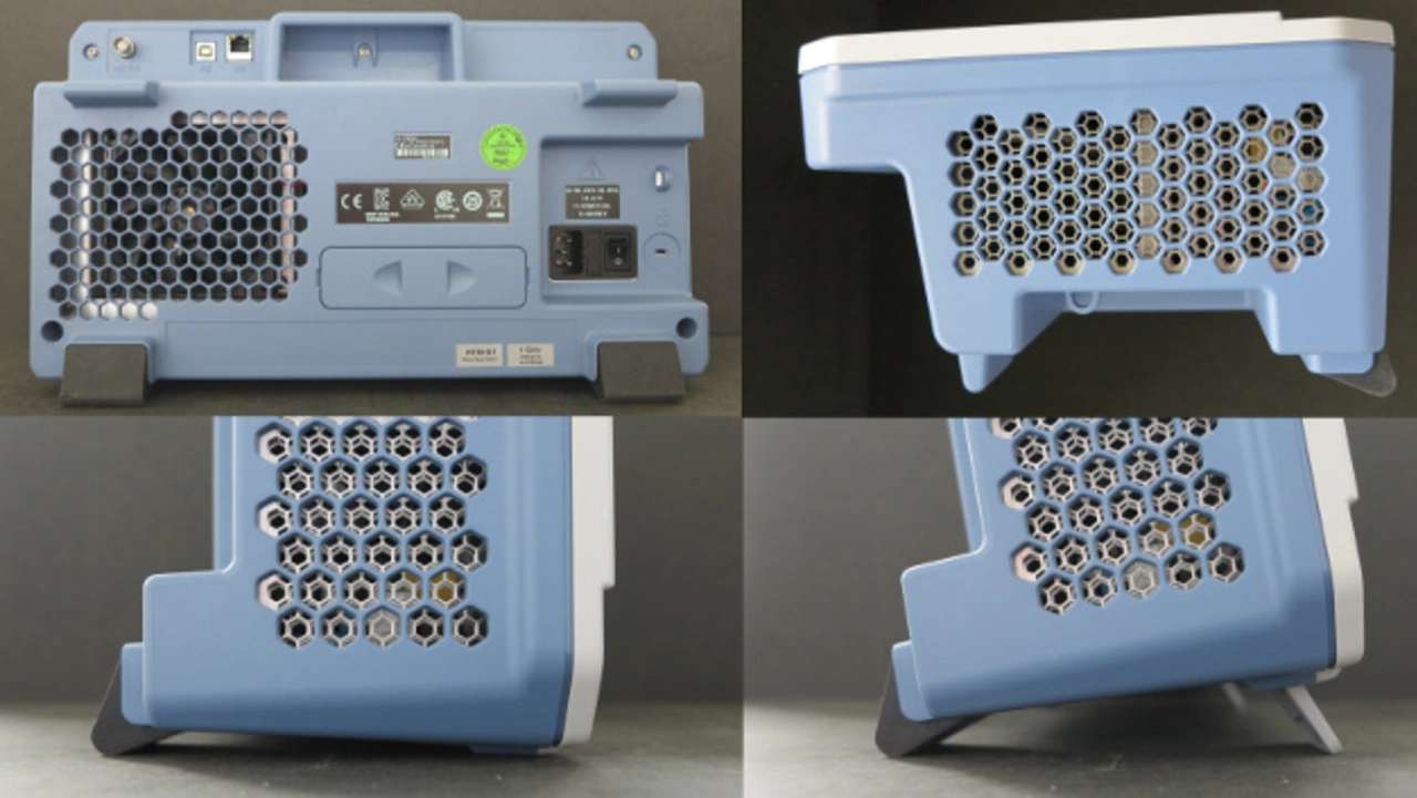 Durch die Lüftungswaben (Bild 3) lässt sich seitlich durch das Gerät blicken; die Oszilloskopelektronik ist mit einem Metallkäfig umgeben. Der Lüfterlärm bewegt sich auf etwas höherem Niveau als beim Lautloswunder RTB2000, etwa dem eines Desktop-PCs. (Spezifiziert sind 28,3 dB(A) Schalldruck in 1 m Abstand) Dafür entwickelt das Gerät selbst nach stundenlanger Aufzeichnung bei höchster Speichertiefe auf sämtlichen Kanälen keine spürbare Erwärmung an BNC-Buchsen oder Oberflächen.