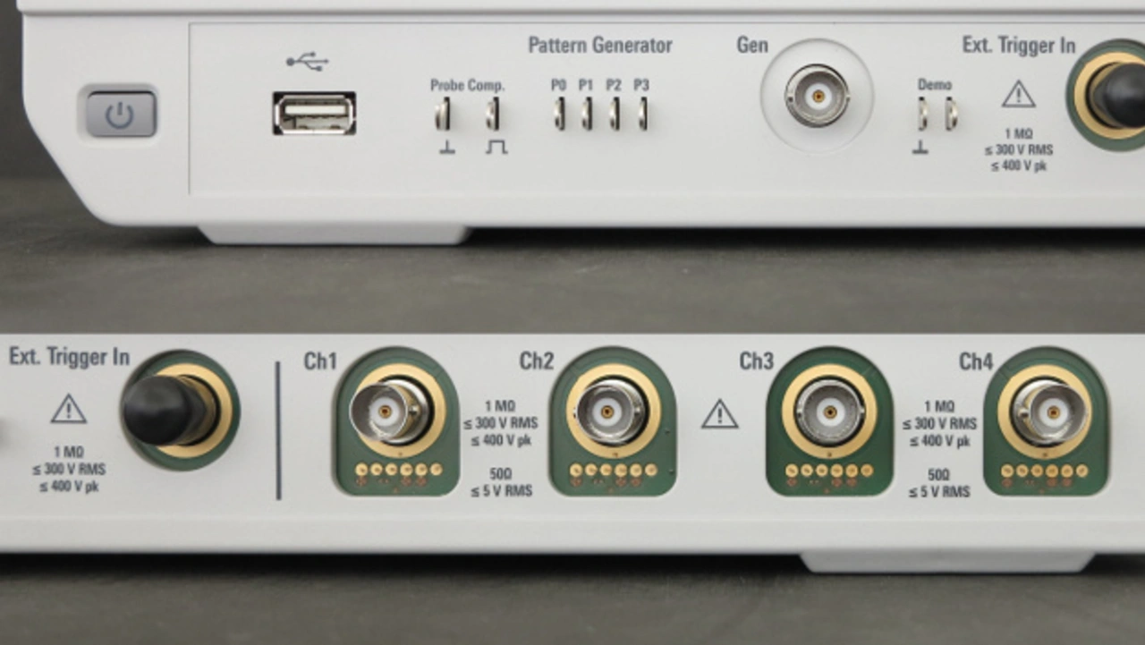 Die Front (Bild 4) zeigt von links nach rechts: USB-Eingang für Peripherie, Tastkopfeichung, Signalgenerator, Funktionsgenerator, Demomodus und schließlich das R&S-ProbeInterface: externer Triggereingang sowie die Eingänge Ch1 - Ch4. Die serifenlose Beschriftung der Schnittstellen ist enorm gut lesbar: Im Abstand einer Armlänge sind Funktion und Einschränkungen mit einem Blick sichtbar.