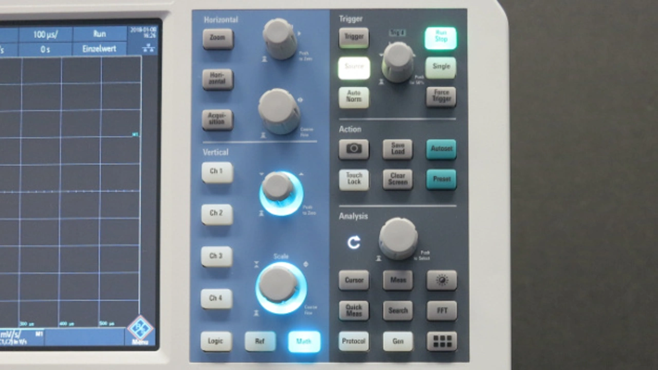 Das physikalische Tastenlayout ist identisch mit RTB2000 und weist eine deutliche Farbsprache der Partitionierung auf: Die rechte Hälfte sammelt aktive Einstellungen auf dunkelgrauem Untergrund [wie Trigger-, Analyse- und Gerätefunktionen], die linke Seite passive Einstellungen [Skalierung, sichtbare Kanäle] auf dunkelblauem Untergrund. Auch hier fällt wieder die übersichtliche Beschriftung, z.B. an den Drehknöpfen, auf. Ein Handbuch benötigen RTM3000-Nutzer im operativen Einsatz definitiv nicht.