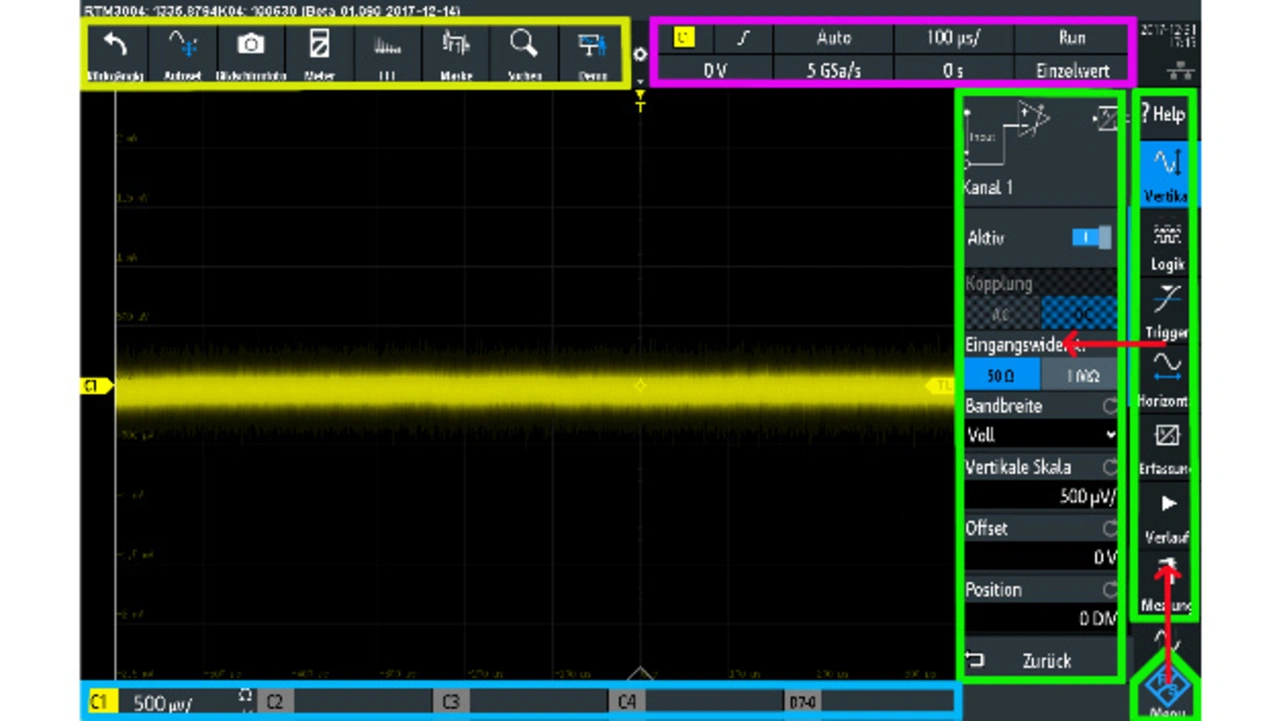 Der untere Bildschirmrand (cyan) zeigt lediglich Kanal/Math/Ref/Logik auf. Ein Touch leistet hier generelle Einstellungen wie Kanal [ein/aus], Eingangsbereich [ 50 Ω / 1 MΩ ], zur vollständigen Konfiguration führt ein Menü-Button ins vollständige Parametriermenü am rechten Rand (grün). An diesen unteren Bildschirmrand werden im Messeinsatz u.a. Leisten für Messwerte, LookUp-Tables oder Speichersegmentlisten, angefügt.