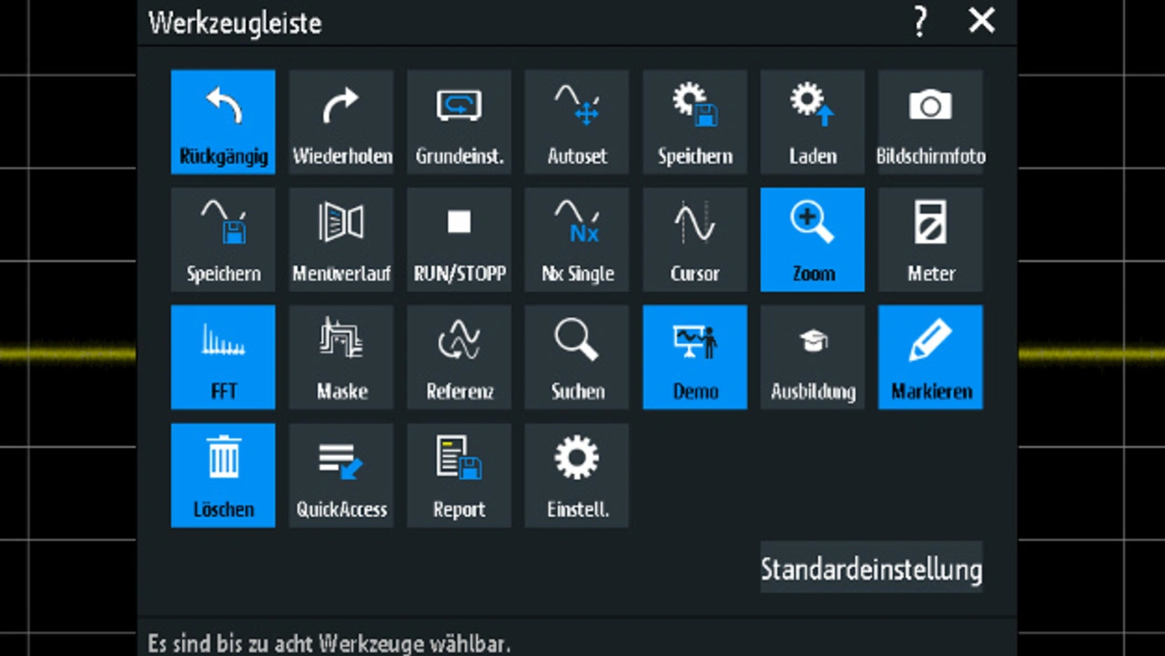 Eine aktive Funktion (z.B. eine Leistungsmessung, FFT oder Erfassung) wird ins Funktionsmenü stets an den obersten Platz angefügt und blau markiert.