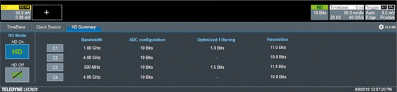 Ebenfalls interessant: Die Auflösung wird seitens des Gerätes dynamisch optimiert, das heißt, es wählt die jeweils optimale AD-Wandler-Konfiguration und schaltet automatisch vom »normalen« in den High-Definition-Modus um, wenn es dies für die gerade gegebenen Messbedingungen für nötig hält, um ein perfektes Messergebnis zu erhalten. Das heißt, das Oszilloskop nutzt jederzeit die optimale Auflösung. Diese automatische Umschaltung lässt sich natürlich manuell auch abschalten. Für Anwendungen, in denen 10 Bit nicht genug sind, kann das HDO9000 durch Einsatz optimierender Filter eine noch höhere Auflösung von bis zu 13,8 Bit verwenden.