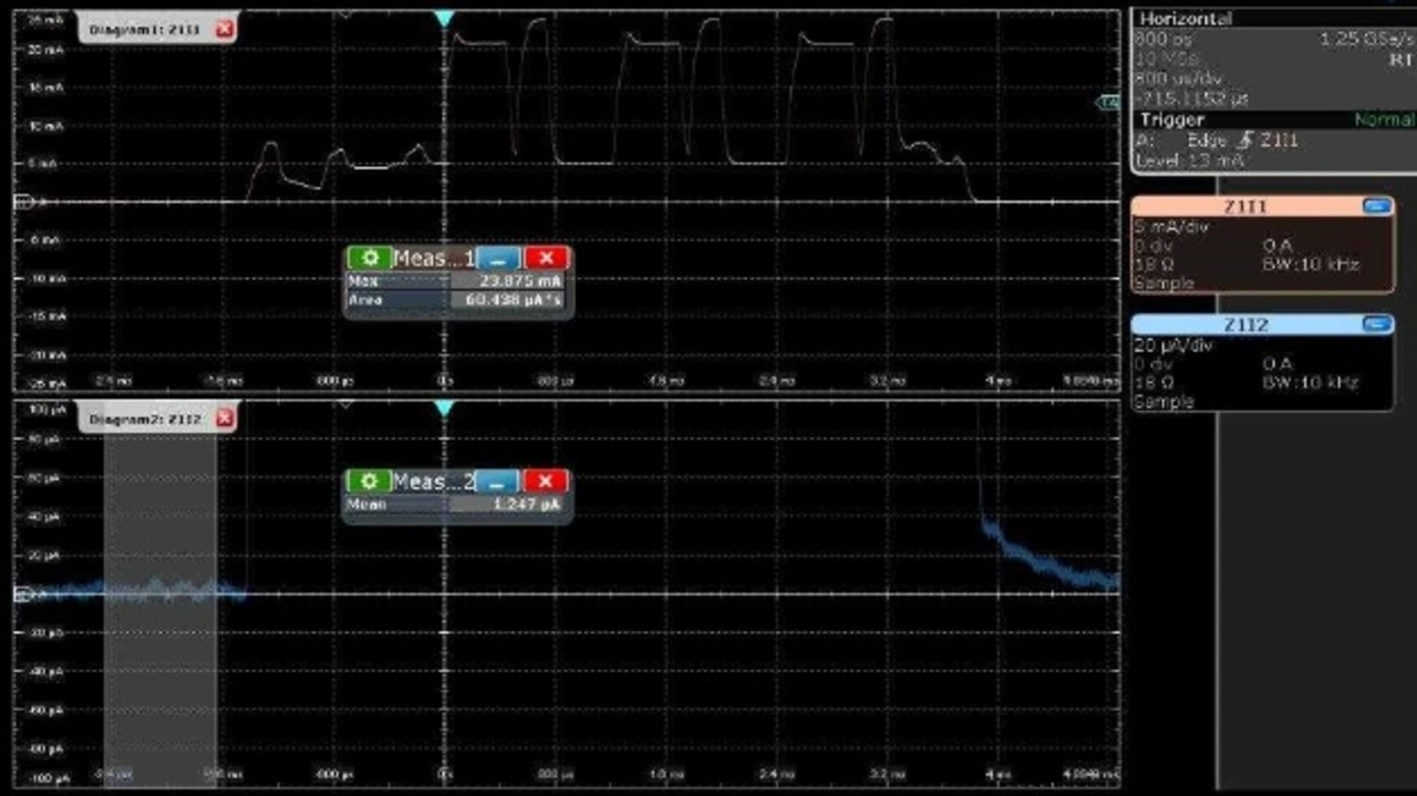 Die im Screenshot gezeigten Ergebnisse entstammen einer typischen High-Side-Strommessung an einem Bluetooth-Low-Energy-Gerät mit einem externen 18-Ω-Shunt. Die obere Messkurve zeigt den Strom während eines kompletten Advertising Events (ohne Zoom), den gemessenen Maximalstrom (Max) und die verbrauchte Ladung (Area). Sie wurde mit der Einstellung für geringe Empfindlichkeit (450 mV) im externen Shunt-Modus des R&S RT-ZVC04 aufgezeichnet. Die untere Messkurve wurde gleichzeitig mit demselben Shunt-Widerstand und der Einstellung für hohe Empfindlichkeit (45 mV) des R&S RT-ZVC04 erfasst. Mit der Zoom-Ansicht kann der Anwender die kleinsten Details in der Strommesskurve betrachten. Obgleich die Stromspitzen in dieser Einstellung den Messbereich des Geräts überschreiten, lässt sich der niedrige Ruhestrom auflösen und in einer Gate-Messung (Mean) mit ca. 1,2 μA bestimmen.