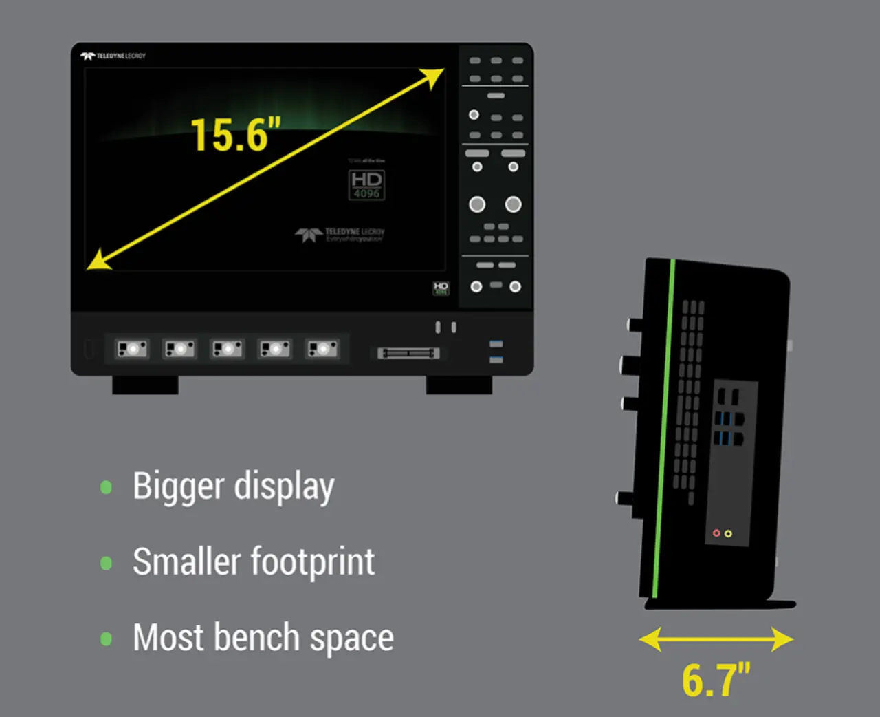 Mit nur 6,7" Tiefe (25 % weniger tief als Konkurrenzprodukte) sind die Oszilloskope der HDO6000B Serie das schlankste Gerät auf dem Markt. Daher benötigt der HDO6000B weniger Raum auf dem Arbeitsplatz, so dass Sie mehr Raum für Ihre Testschaltungen und Tastköpfe haben und sich mehr auf Ihre Designvalidierung konzentrieren können.