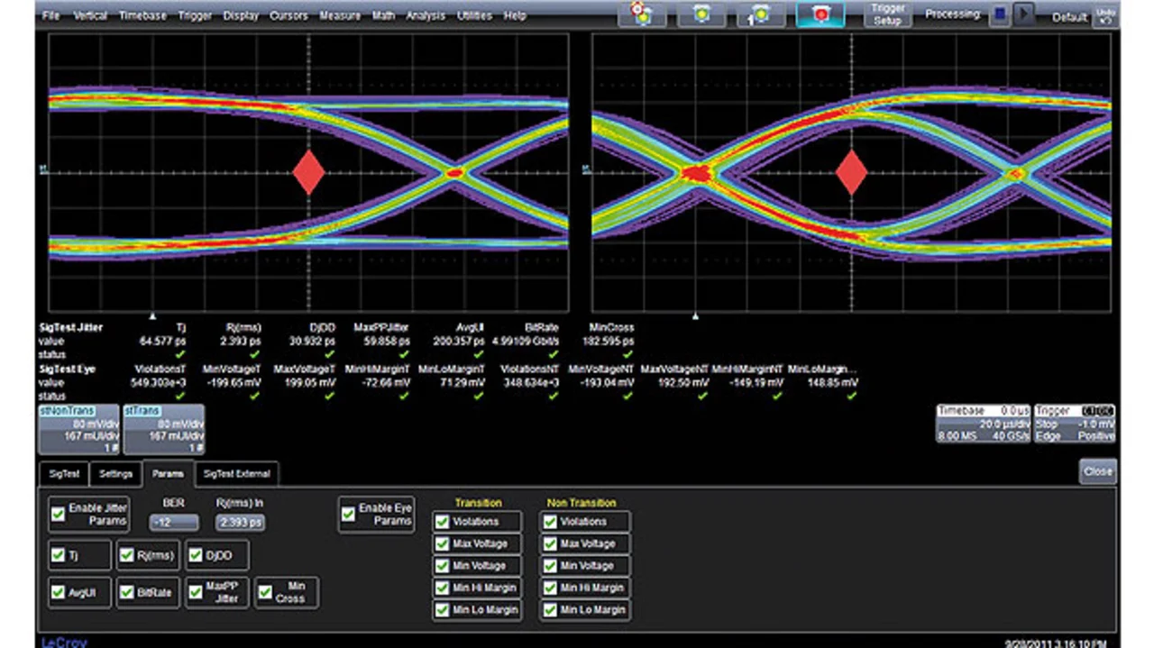 Typischerweise definiert ein serieller Datenstandard eine Liste von Parametern der physikalischen Schicht wie Spannungspegel, Anstiegszeit, Signalform und Stabilität (hier: Jitter und Augendiagramm). Diese Liste kann ziemlich umfangreich sein. So umfassen die notwendigen Tests für USB 3.0 die Darstellung von Augendiagrammen, die Charakterisierung des SSC (Spread-Spectrum-Takts), die Jitter-Erfassung und eine breite Palette von anderen Testparametern. Diese Tests wurden ursprünglich von Intel geschrieben - sie werden auch häufig als“Sigtest“ bezeichnet. Eine Compliance Test Software wie „QualiPHY“ hilft dabei, diese Messungen konform zum Standard durchzuführen, ohne dass der Anwender sich bis in alle Tiefen mit der Bedienung des Messgerätes auskennen muss. Der Entwickler hat dadurch eine große Sicherheit, dass sein Schaltungsdesign die angestrebten Zertifizierungs-Parameter erfüllt, bevor dies in einem USB-3.0-Testlabor offiziell nachzuweisen ist.