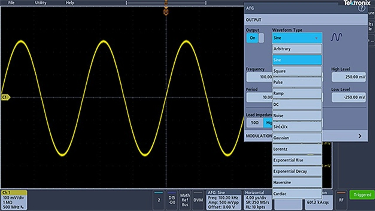 Das MDO der 3er-Serie enthält einen optionalen integrierten Arbiträrfunktionsgenerator (Option 3-AFG), der sich perfekt für die Simulation von Sensorsignalen innerhalb eines Designschilds oder das Hinzufügen von Rauschen zu Signalen zur Durchführung von Margentests eignet. Der integrierte Funktionsgenerator liefert vordefinierte Wellenformen bis zu 50 MHz für Sinus, Rechteck, Impuls, Rampe/Dreieck, Gleichstrom, Rauschen, Sin(x)/x (Sinc), Gauß, Lorentz, exponentiellen Anstieg/Abfall, HaverSine und Kardiosignal.