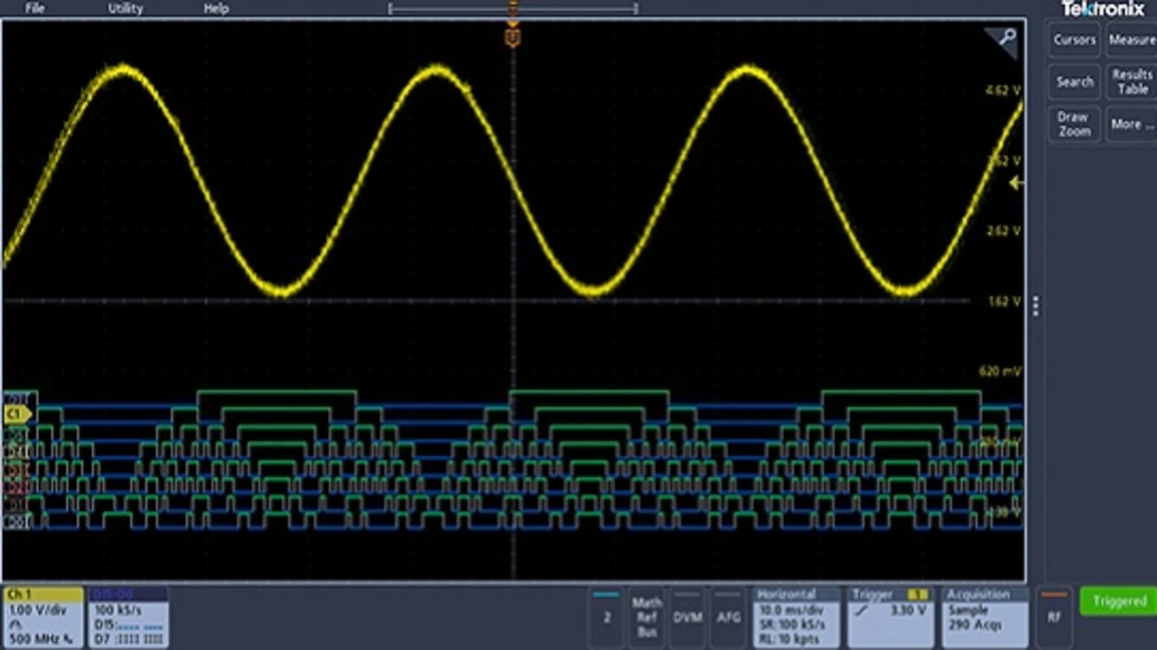 Der Logikanalysator (Option 3-MSO) bietet 16 digitale Kanäle, die eng in die Benutzeroberfläche des Oszilloskops integriert sind. Dies vereinfacht die Bedienung und ermöglicht die einfache Lösung von Mixed-Signal-Problemen.