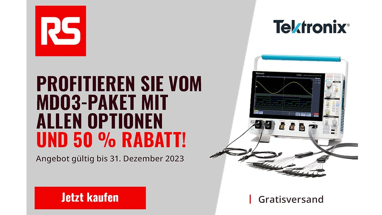 Profitieren Sie vom Tektronix MDO3-Paket mit allen Optionen und 50% Rabatt von RS: Das Angebot enthält ein MDO-3 Tischoszilloskop komplett mit vorinstallierter Software (3-AFG, 3-MSO, 3-BND).