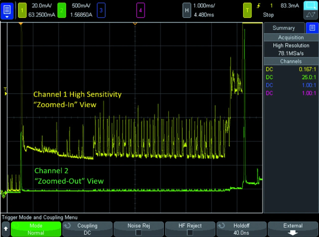 Sobald das breite Spektrum an Strömen präzise auf dem Oszilloskop-Bildschirm erfasst wurde, kann daraus abgeleitet werden, wie das Design angepasst werden muss, um die Energieeffizienz zu erhöhen. Die Fläche unter den Kurvenmessungen macht es möglich, die elektrische Ladung (Q) zu verstehen und den Stromverbrauch im Laufe der Zeit einfach zu berechnen. Auf diese Weise werden Bereiche aufgezeigt, in denen Energie verschwendet wird. Es können Messpunkte auftreten, an denen sich das Gerät im Ruhezustand befinden sollte, aber einige Funktionen, die unnötigerweise Strom verbrauchen, bleiben möglicherweise sichtbar.