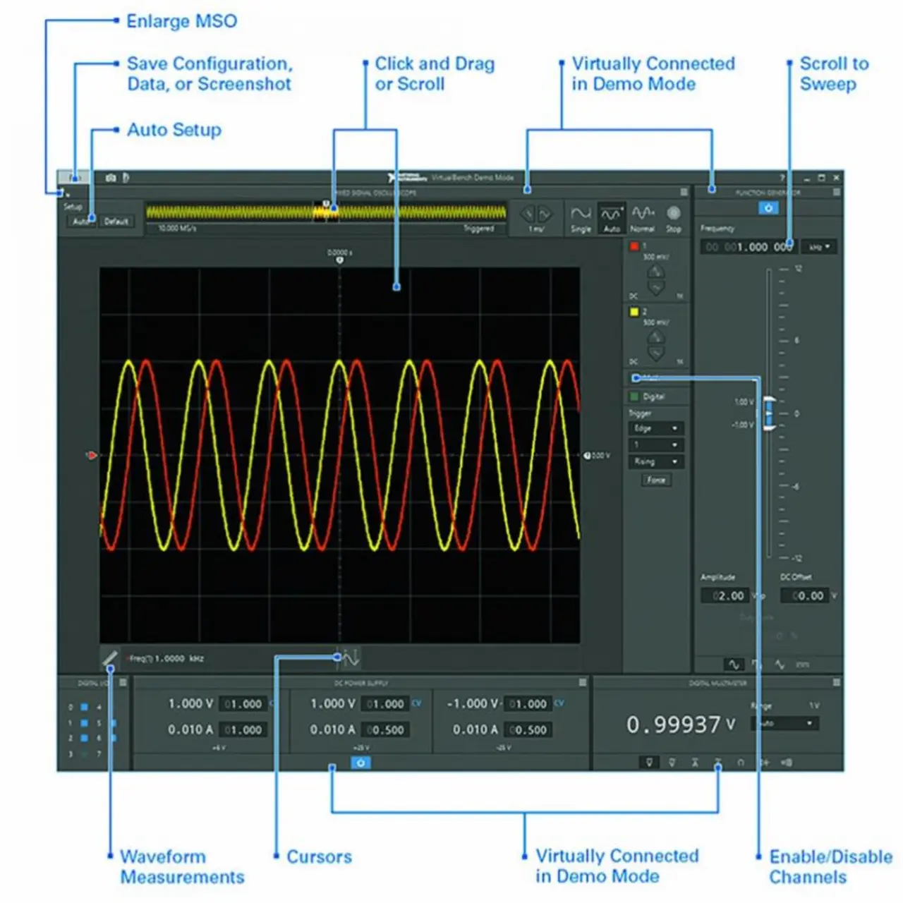 Seit der Veröffentlichung von VirtualBench wurde über kostenfreie Firmware-Updates freie FPGA-Kapazität genutzt, um mit dem Anwenderfeedback die Gestaltung der Bedienoberfläche zu verbessern und die Gerätefunktionalität zu erweitern. Hinzu kamen z. B. die Digital-Phosphor-Technologie sowie Funktionen zur Signalaufzeichnung und -wiedergabe vom Oszilloskop zum Signalgenerator. Auch gibt es neue Funktionen zur Decodierung digitaler I2C- und SPI-Signale.