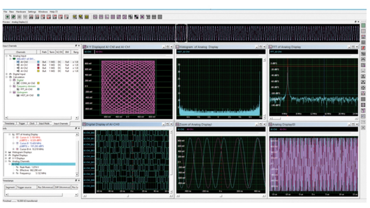 SBench 6 enthält Anzeige-, Steuerungs-, Mess- und Analysefunktionen, mit deren Hilfe der Digitizer wie ein Oszilloskop betrieben werden kann. Bild 1 veranschaulicht die Vielseitigkeit der SBench 6 mit einem M4i-Digitizer. Im Bild sind neben dem Ergebnis der Datenaufzeichnung (rechts unten), die gleiche Aufzeichnung horizontal gestreckt (Mitte unten), ein X-Y-Plot dieser Signale (links oben), eine digitale Darstellung der 14 Bits des Signals (links unten), eine FFT von Kanal 1 (rechts oben) sowie das Histogramm desselben Signals (Mitte oben) dargestellt. Man sieht, dass durch die Kombination eines Digitizers mit SBench 6 sämtliche Anzeige- und Analysefunktionen eines Oszilloskops zur Verfügung stehen. Die Verwendung der integrierten Mess-Cursoren wird in der FFT-Anzeige gezeigt, indem Amplitude und Frequenz der Spektrallinien bei 5 und 15 MHz gemessen werden. Die Messwerte der Cursoren sind im Info-Fenster links unten unter dem Titel der entsprechenden FFT-Anzeige dargestellt.
