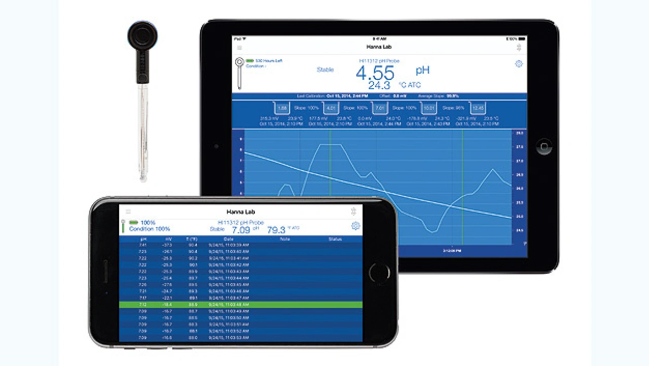 Ähnlich funktioniert auch die Lab App von Hanna Instruments (Bild 4), die schon in der zweiten Version existiert. Die App ermöglicht drahtlose pH- und Temperaturmessungen mit dem iPhone oder iPad. Über Bluetooth 4.0 kommuniziert die App mit allen kompatiblen pH-Elektroden in Reichweite. Nach Auswahl einer Elektrode werden ihre Daten wie etwa die Seriennummer oder Kalibrierdaten automatisch geladen und das System ist messbereit. Aktuell stehen für die Benutzung mit der App fünf verschiedene Mitglieder der Halo-Elektrodenfamilie von Hanna zur Verfügung.