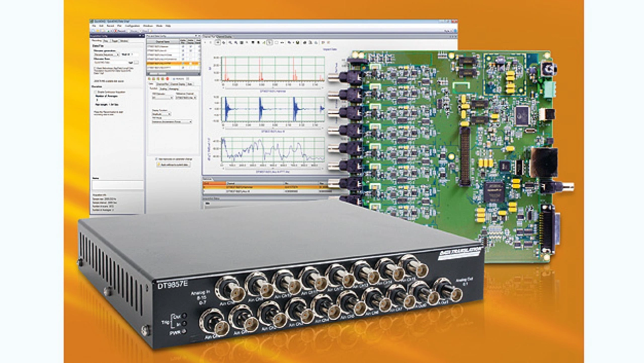 So ist zum Beispiel das USB-Messgerät DT 9857E von Data Translation (Bild 5) auch für Mess- und Prüftechnik im Fahrzeug geeignet. Der große Versorgungsspannungsbereich von 4,75 V bis 28 V ist so ausgelegt, dass auch im Fahrzeug auf jeden Fall eine entsprechende Spannungsversorgung zur Verfügung steht. Fürs Messen bietet das USB-Gerät je nach Version acht oder 16 Analogeingänge (24 bit, bis 105,4 kHz Abtastrate), zwei 32-bit-Analogausgänge sowie Digital-I/O, Tachoeingang (32 bit, ±30 V) und diverse Counter. Für jeden Eingang lässt sich separat eine 4‑mA-IEPE/ICP-Sensorspeisung zu- oder abschalten.