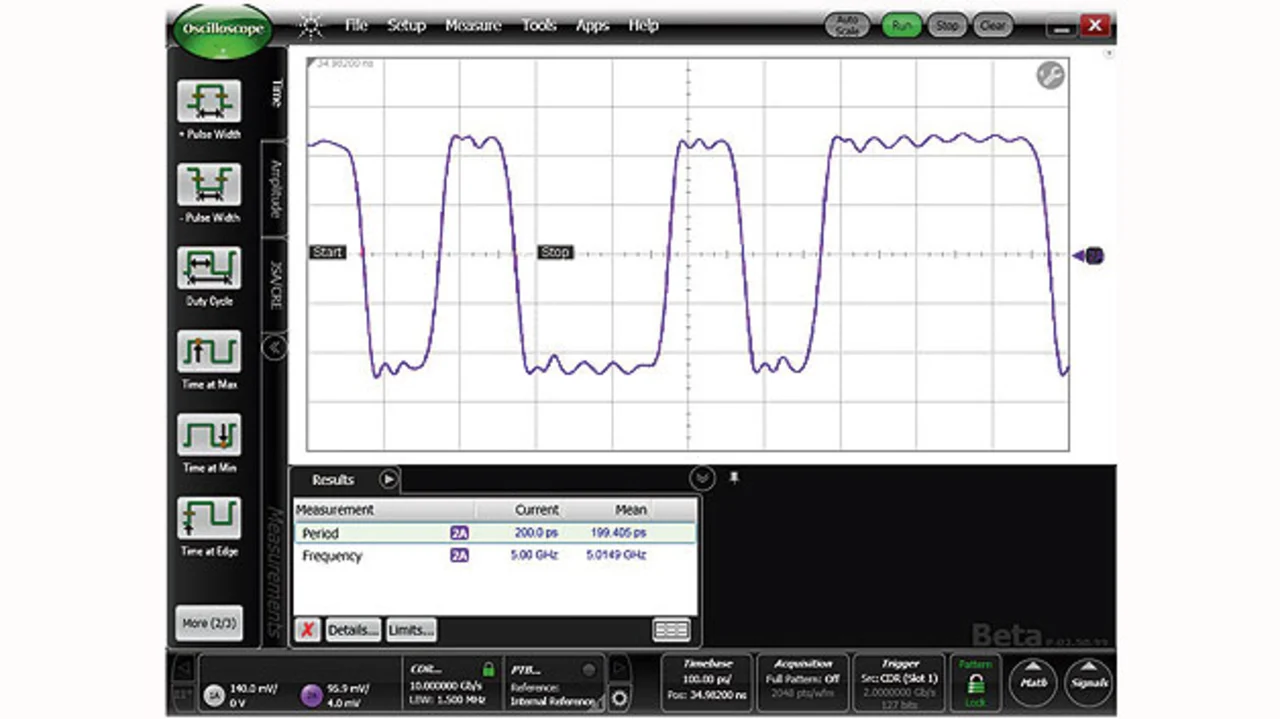 Betrachtet man Digitaldaten auf einem Oszilloskop, würde man eine Folge praktisch rechteckiger Impulse erwarten (die für Einsen stehen) und die Abwesenheit von Impulsen, was für logische Nullen steht. Bei einem schnellen Digitalsignal sieht man das so aber nicht. Die Einsen sind dort längst nicht so rechteckig wie erwartet, und die Nullen sind keine glatten Linien auf Nullniveau. Stattdessen sieht man erheblich geneigte Flanken, die einen Gutteil der Bitzeit in Anspruch nehmen. Wechselt ein Signal von 0 auf 1, schwingt es möglicherweise über, bevor es sich auf dem Nennpegel beruhigt (Bild 2).
