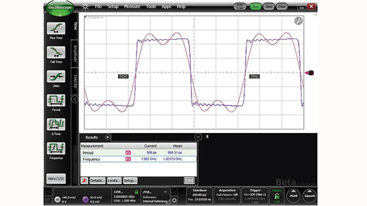 Bild 3 zeigt, was das Tiefpassfilter aus dem Rechtecksignal macht: Die Flanken sind flacher, „Böden“ und „Dächer“ des Rechtecksignals sind nicht mehr eben. Das Signal sieht jetzt aus, als sei eine langsame Sinuskurve (ein 1-GHz-Ton) mit einer schnelleren (einem 3-GHz-Ton) überlagert. Das Filter arbeitet also wie erwartet.