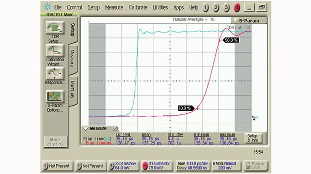 Eine andere, verwandte Methode zur Charakterisierung eines Übertragungskanals besteht darin, einen sehr schnellen Spannungssprung auf den Kanal zu geben und mit einem breitbandigen Oszilloskop zu beobachten, was am anderen Ende herauskommt. Der Vergleich von Eingangssignal und Ausgangssignal zeigt, ob und wie der Kanal digitale Bits beschädigt. Man bezeichnet diese Technik als Zeitbereich-Transmissionsmessung (TDT, Time-Domain Transmission). Bild 5 zeigt eine solche Messung am gleichen Kanal wie in Bild 4. Die blaue Kurve ist das Eingangssignal, die rote zeigt den Spannungssprung, wie er am Ende der Leiterbahn ankommt. (Der Zeitversatz zwischen beiden Kurven wurde verringert, damit man sie leichter vergleichen kann.). Das Bild zeigt zwar nicht die Impuls-antwort des Kanals, sondern die Sprungantwort, die Ergebnisse sind aber ähnlich. Bei einem idealen Übertragungskanal wäre der Sprung am Ausgang deckungsgleich mit dem Sprung am Eingang, er wäre nur entsprechend der Laufzeit im Kanal verzögert. Aber wie bei der Impulsantwort erfahren auch hier die hohen Frequenzen eine Dämpfung, welche die Flankensteilheit verringert. Warum? Das liegt daran, dass für eine steile Flanke hohe Frequenzen nötig sind und diese bei der Übertragung abgeschwächt werden.