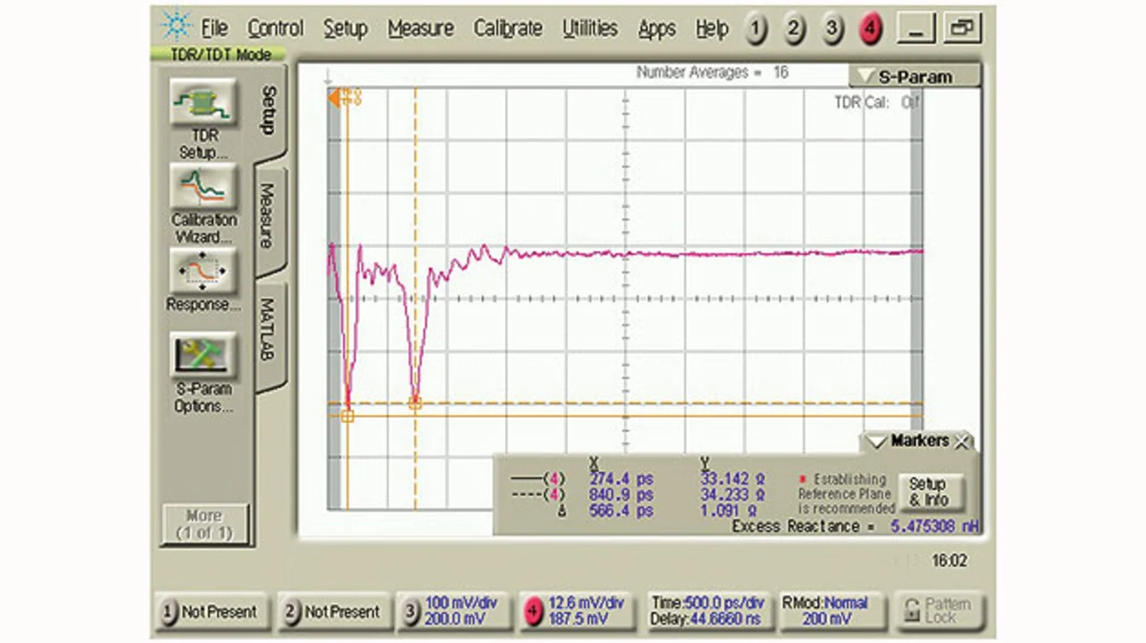 Bild 6 zeigt das Ergebnis einer TDR-Messung an einer 50-Ω-Übertragungsleitung, in deren Verlauf die Impedanz auf 33 Ω fällt, dann wieder auf 50 Ω steigt, dann wieder auf 33 Ω fällt und schließlich wieder auf 50 Ω steigt.