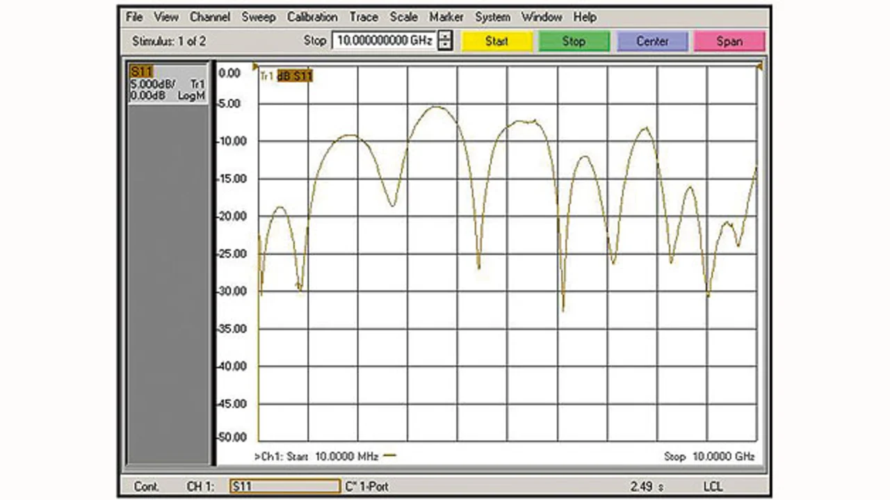 Obwohl der Netzwerkanalysator das Bestehen mehrerer Reflexionspunkte nicht direkt anzeigen kann, ist die typische Form des Frequenzgangs ein deutliches Zeichen dafür, dass mindestens zwei dominierende Reflexionsstellen vorhanden sind.