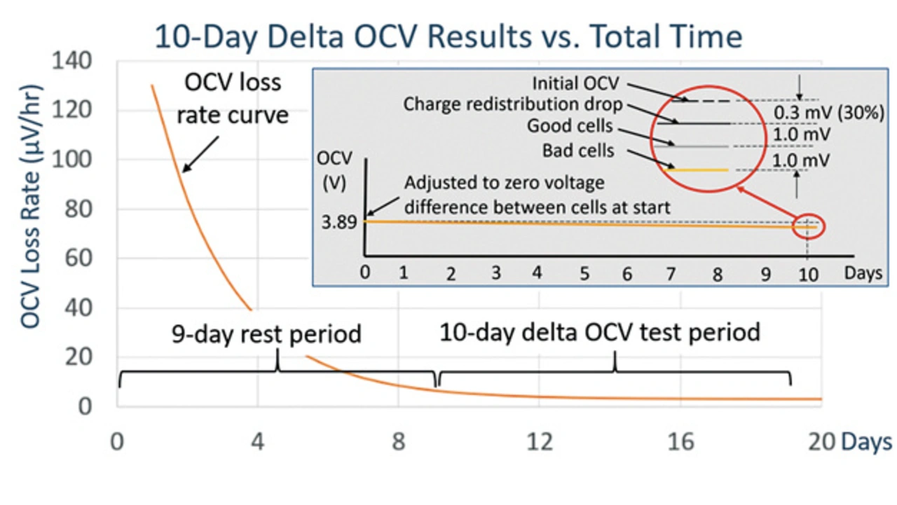 Während diese Charakterisierung für diese Zellen bei 80 Prozent SoC recht gut ist, wird aufgrund der unterschiedlichen Steigung der Entladungskurve in Bild 5 bei einem anderen SoC-Level ein anderes Korrelationsverhältnis für die OCV-Abnahme erforderlich sein. Wenn man dies versteht, ist es möglich, entweder die Delta-OCV- oder die potenziostatische Messmethode zu verwenden und die Ergebnisse der beiden Methoden miteinander zu korrelieren sowie sie mit der prozentualen Rate des Selbstentladungsverlustes der Zelle zu verknüpfen.