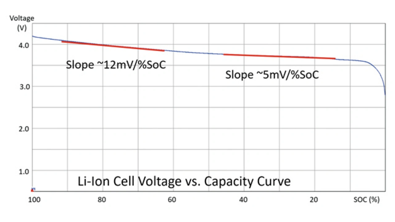 Die Delta-OCV-Methode erlaubt nur einen indirekten Schluss auf die Selbstentladungsrate. Die Abnahme der Leerlaufspannung über die Zeit korreliert mit der Selbstentladungsrate der Zelle über die Steigung der Entladekennlinie der Zelle. Dies wird in Bild 5 für die hier getestete Gruppe von 18650er-Zellen mit 2,4 Ah veranschaulicht, die bei einer sehr niedrigen Entladungsrate gemessen wurden. Die Steigung der Kennlinie ist bei hohen und niedrigen SoC-Werten größer und bei den mittleren SoC-Werten minimal.