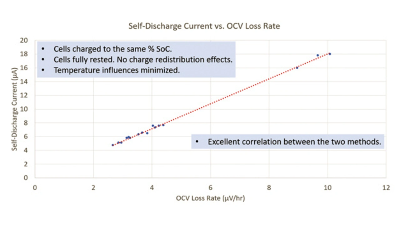 Werden die oben genannten Faktoren sorgfältig überwacht, erhält man konsistente und zuverlässige Messergebnisse der Selbstentladung, unabhängig von der verwendeten Methode. In Bild 6 sind die Ergebnisse beider Methoden aufgetragen: Auf der vertikalen Achse befinden sich die Werte des Selbstentladestroms, die mit der potenziostatischen Methode gemessen wurden, und auf der horizontalen Achse die entsprechenden Werte für die Abnahme der Leerlaufspannung, ermittelt mit der Delta-OCV-Methode. Die Ausgleichsgerade verläuft durch alle Punkte und auch durch den Ursprung. Dies zeigt eine starke Korrelation zwischen den beiden Messmethoden und bestätigt, dass mit beiden Methoden valide und konsistente Ergebnisse erzielt werden