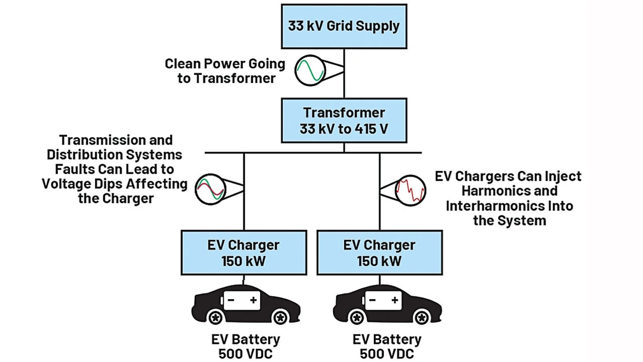 Aus der Sicht des Energieversorgers bewirken die in EV-Ladepunkten enthaltenen, auf Leistungselektronik basierenden Umrichter den Eintrag von Harmonischen und Zwischenharmonischen. Ladegeräte mit mangelhaft entwickelten Leistungswandlern können sogar Gleichströme in das Netz einspeisen, und Schnelllader verursachen möglicherweise schnelle Spannungsschwankungen und Flicker. Aus Sicht der Ladepunkte können Fehler in den Übertragungs- und Verteilsystemen zum Auftreten von Einbrüchen oder Totalausfällen der Netzspannung führen. Sinkt die Spannung unter die Mindestspannung des EV-Ladegeräts ab, kann dies ein Ansprechen des Unterspannungsschutzes und das Trennen der Netzverbindung zur Folge haben, was der Nutzererfahrung äußerst abträglich ist [5].