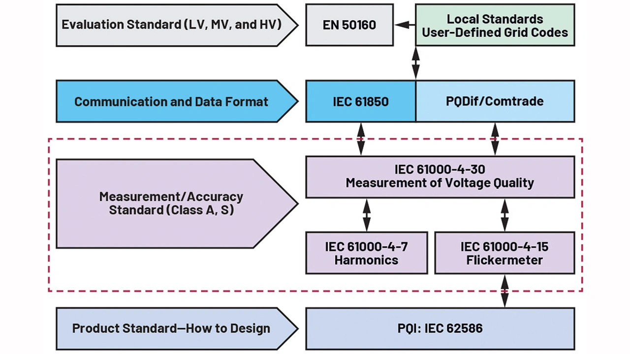 In den Spannungsqualitätsstandards sind messbare Grenzwerte dafür spezifiziert, wie weit die verschiedenen Parameter von ihren Sollwerten abweichen dürfen. Für die einzelnen Komponenten des Elektrizitätsversorgungssystems gelten jeweils verschiedene Normen. In der Norm IEC 61000-4-30 der International Electrotechnical Commission (IEC) etwa sind die Messmethoden und die Ergebnisinterpretation von Spannungsqualitätsparametern für Wechselstrom-Versorgungssysteme festgelegt. Dabei sind die Spannungsqualitätsparameter für Grundfrequenzen von 50 Hz und 60 Hz definiert. Die Norm unterscheidet außerdem zwischen zwei Klassen von Messgeräten – Klasse A und Klasse S.